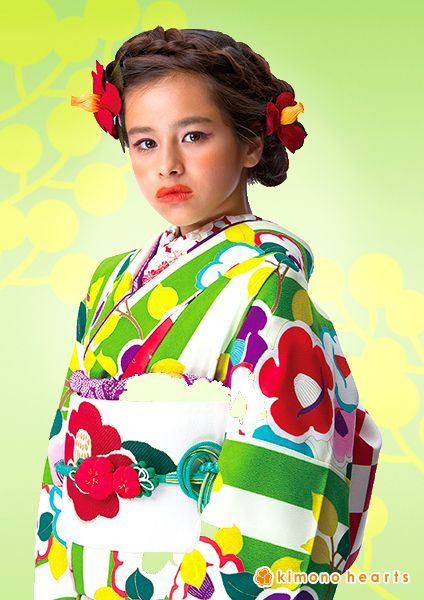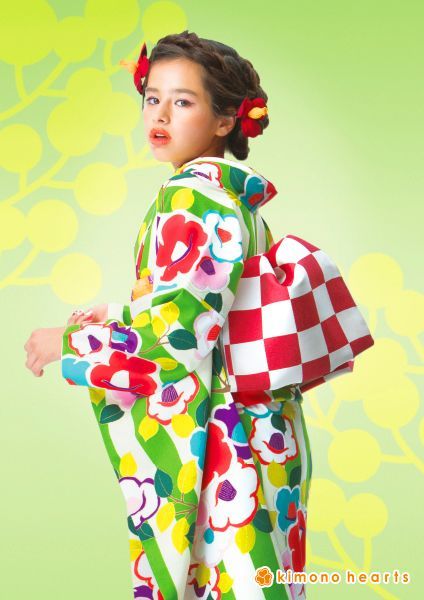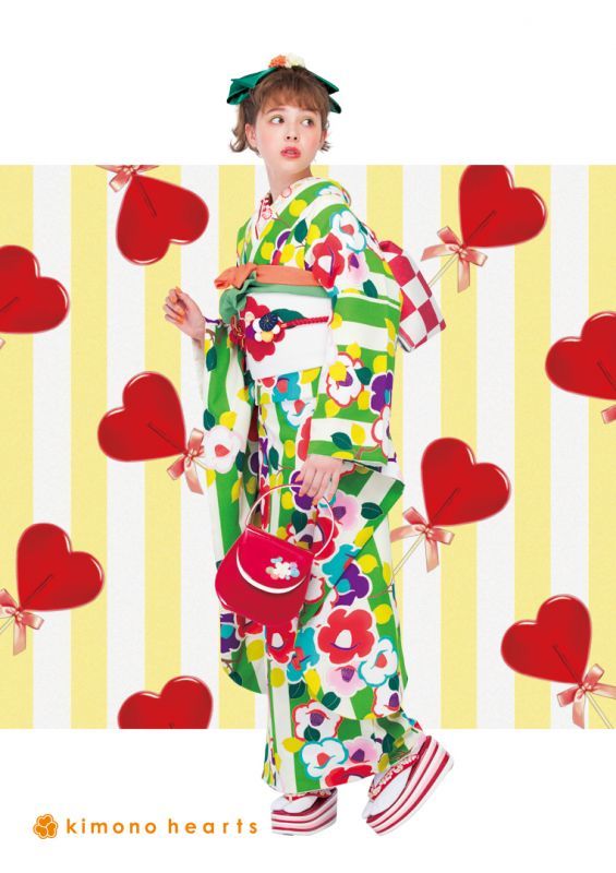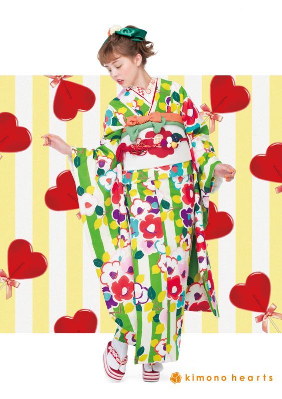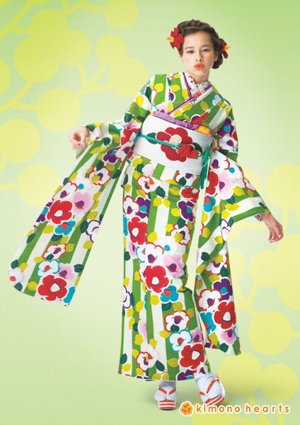 オリジナルカラーのボタニカル振袖。ストライプがスタイルをすっきり見せてくれる。