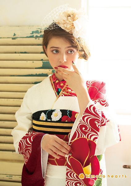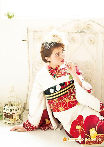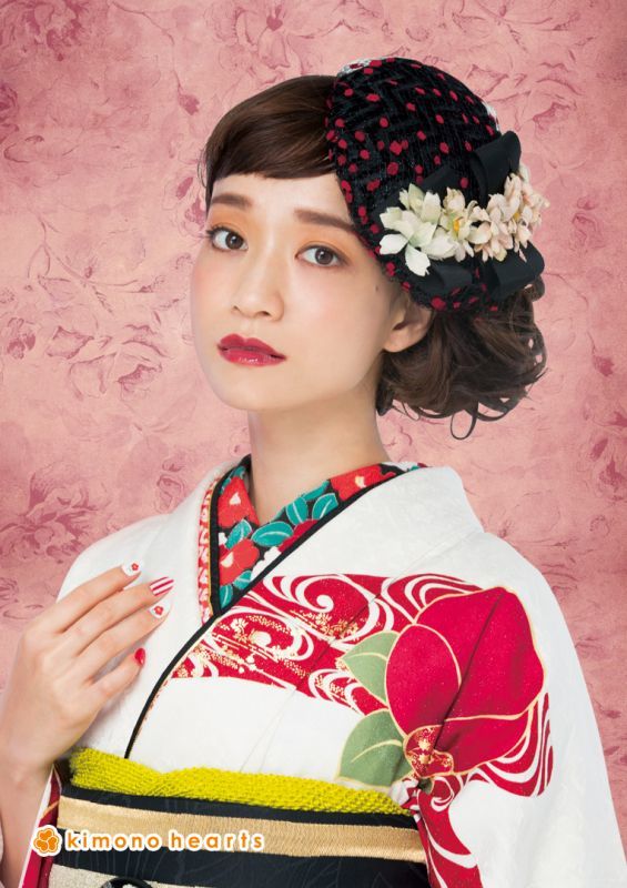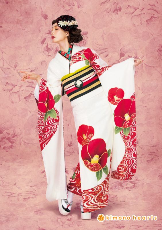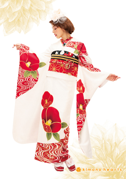 白地のスッキリさに大胆な椿が印象的なお振袖。大きな柄でインパクトがありながらも、白地が華やかさを演出してくれます。