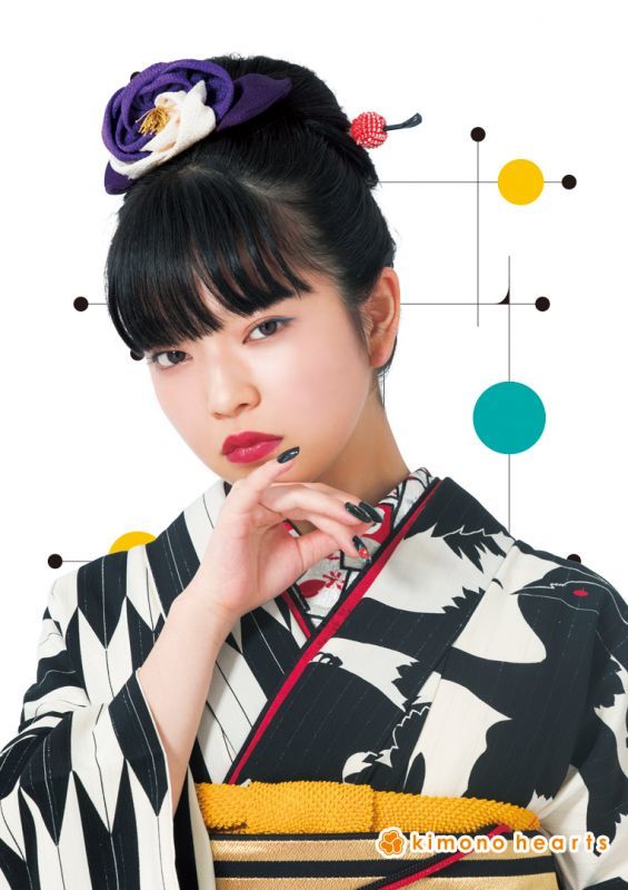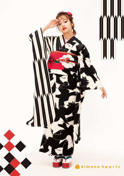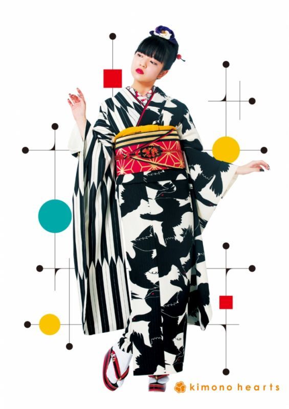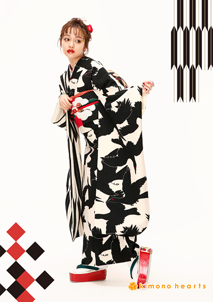 和風感ICHIのレトロモダンのお振袖。八咫烏と矢羽柄で半分づつ柄が違い、とことんお洒落にしています。八咫烏は三本足の神様で道案内をしたと言われ、日本サッカーのエンブレムとしても有名です。色も白黒で格好良く、モードにしたい方にオススメです。