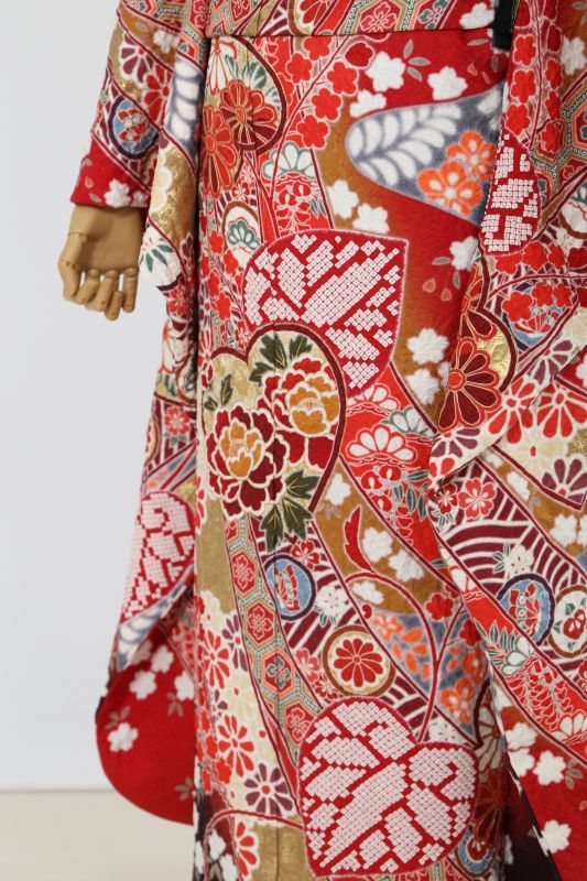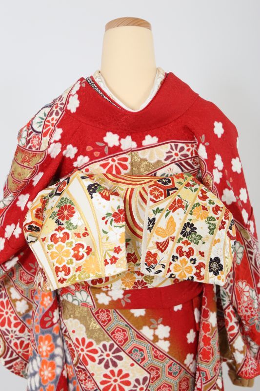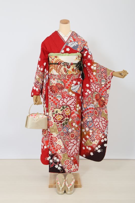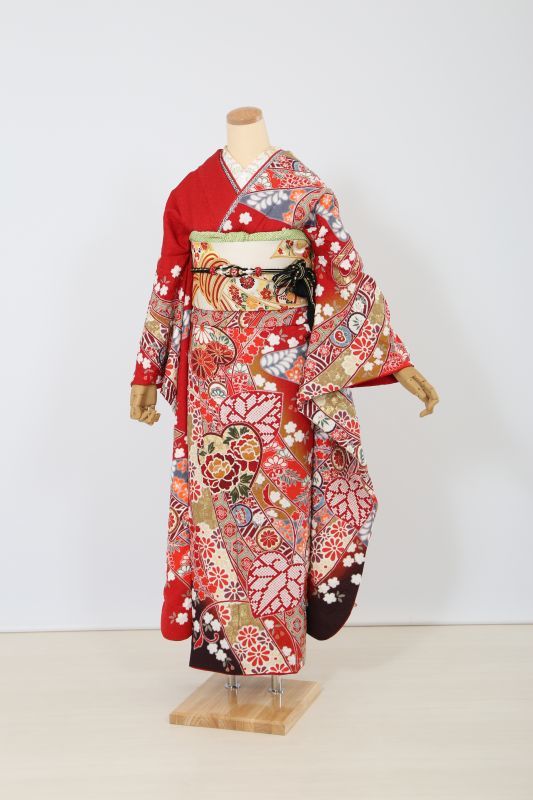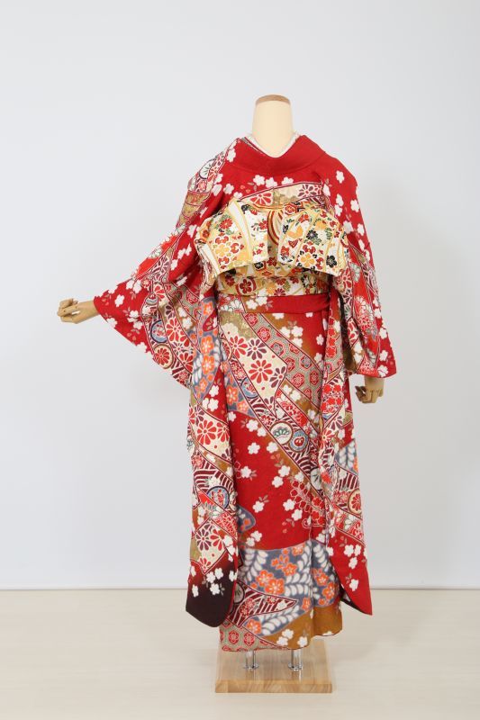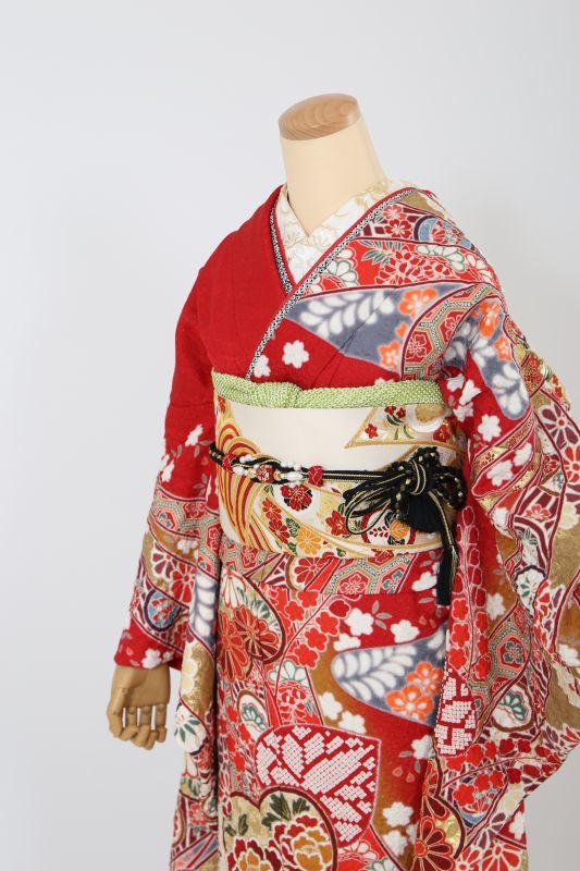 絞りで有名な滝泰さんのお振袖。深い赤色に大きな熨斗目柄。その中に古典柄があり、豪華な1枚です。絞りの雰囲気もでて重厚感がでます。