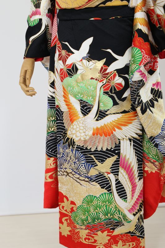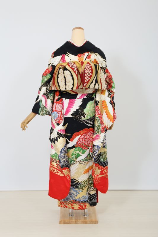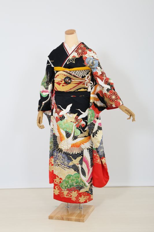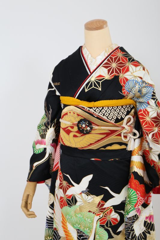 黒地に鶴がかっこいい粋なお振袖。金彩で描かれた柄が豪華さを際立たせる一枚です。