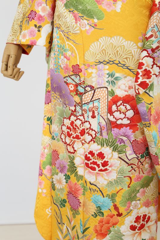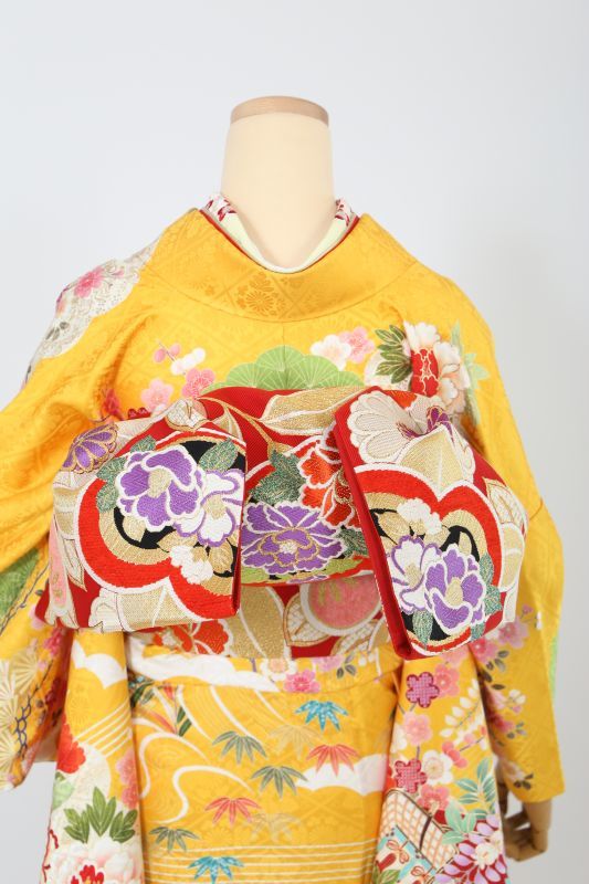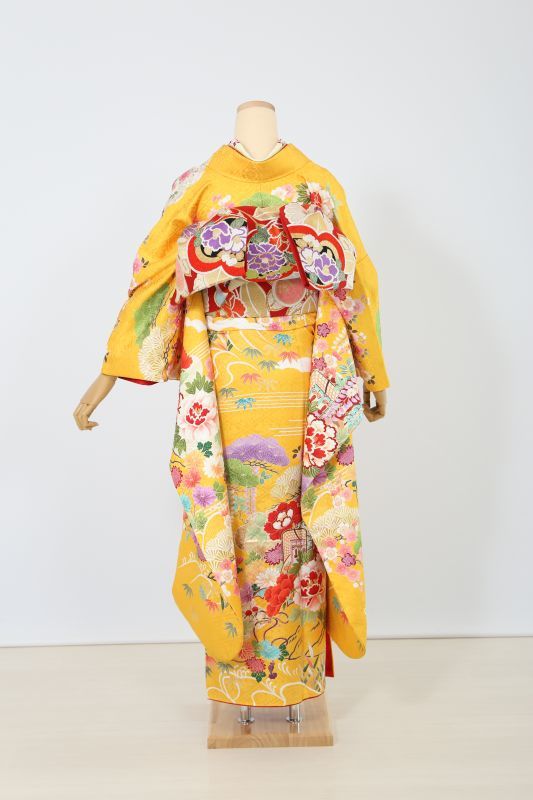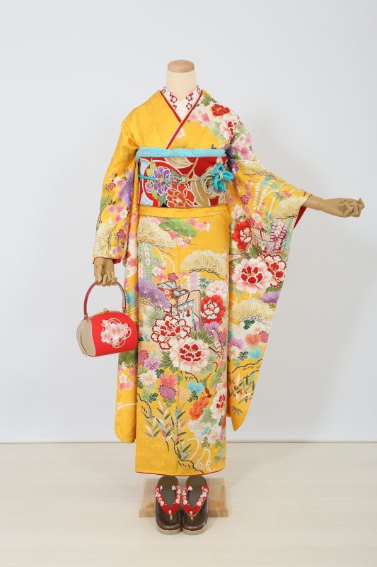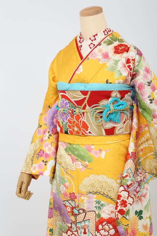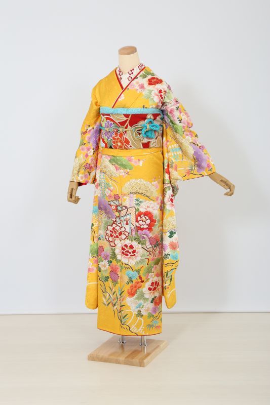 濃い黄色に、御所車や牡丹、松など。伝統的な古典柄のお振袖。珍しい色で華やかに目立ちます。