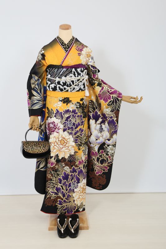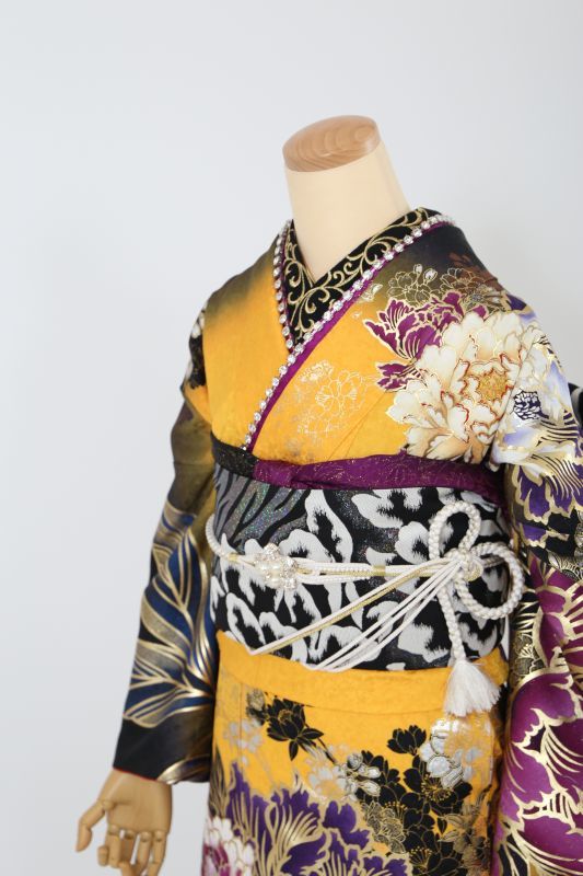 黒と黄色のコントラストがカッコイイSweetAngelのブランド振袖。金彩で囲まれた大きな牡丹がインパクト抜群。金箔もたくさんあってゴージャスな一枚。