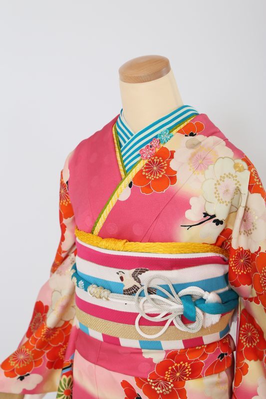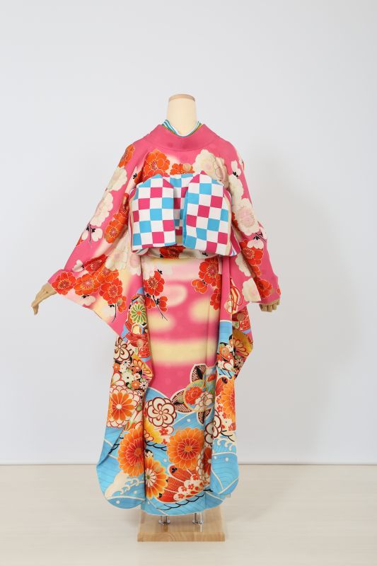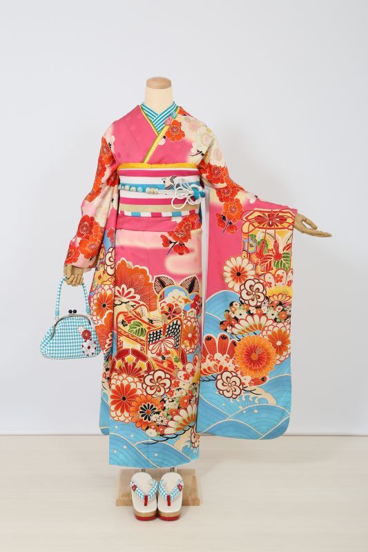 blytheのブランド振袖。柄は御所車に裾が青海波と伝統的な古典柄なのに色が濃いピンクと水色でモダンに。カラフルコーデがおススメ。