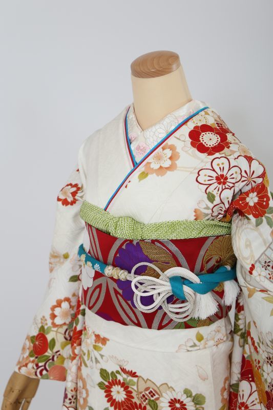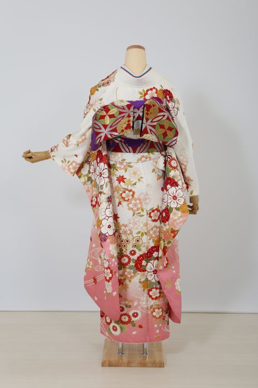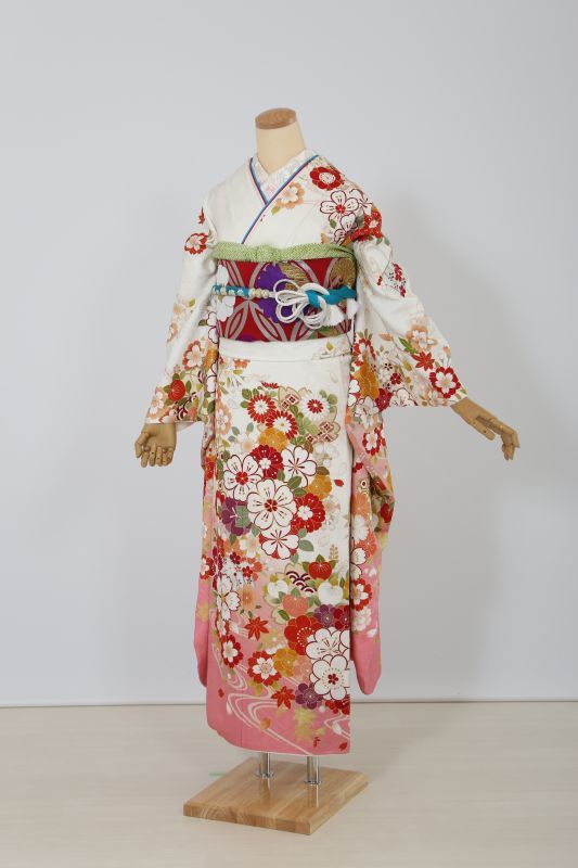 白地に裾がピンクの可愛らしいお振袖。小さいお花が舞っており、女の子らしく、かつ上品さも出てきます。