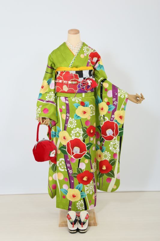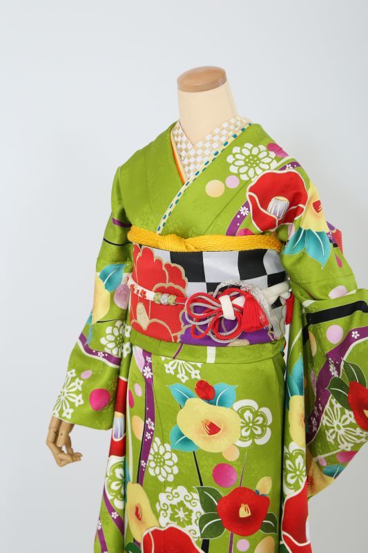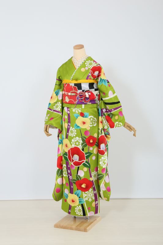 成人式振袖フルセット レトロ古典 黄緑 椿 ポップ