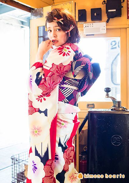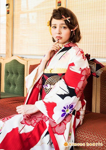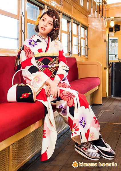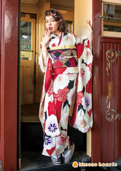 大きな矢羽柄に梅のお花が可愛い、大正ロマンなお振袖。地の色はクリーム色で、上品さも出してくれます。