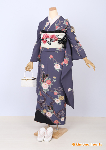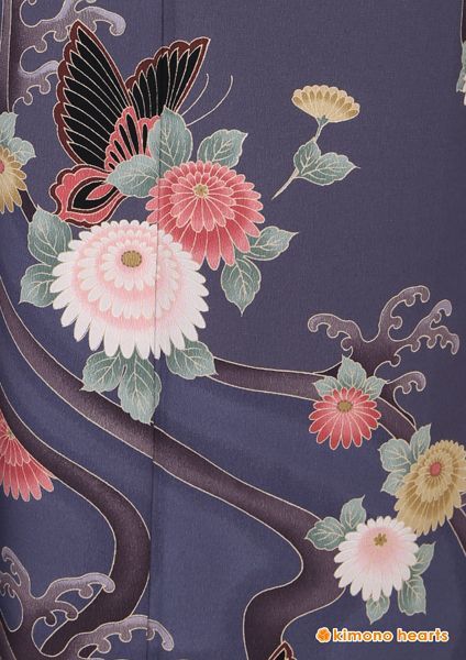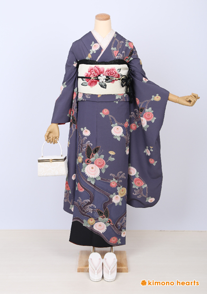 珍しいグレーのお振袖。くすみ色で描かれた蝶々やお花が儚げなノスタルジックの雰囲気を醸し出します。上品と可愛さを兼ね備えた一枚。
