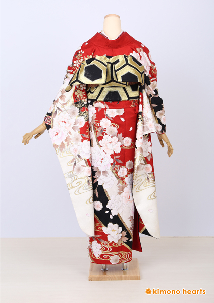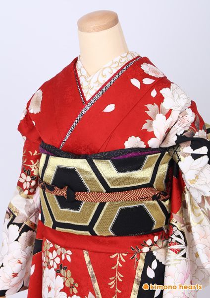深い赤に大きな牡丹・流水柄がカッコイイ振袖。大きく黒地色もはいっており、粋な雰囲気になります。