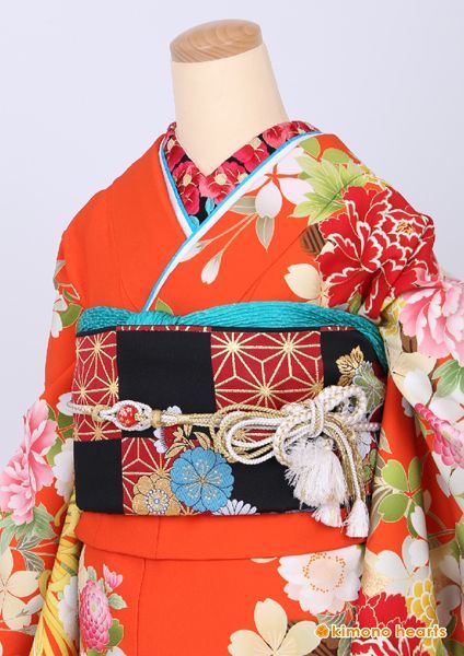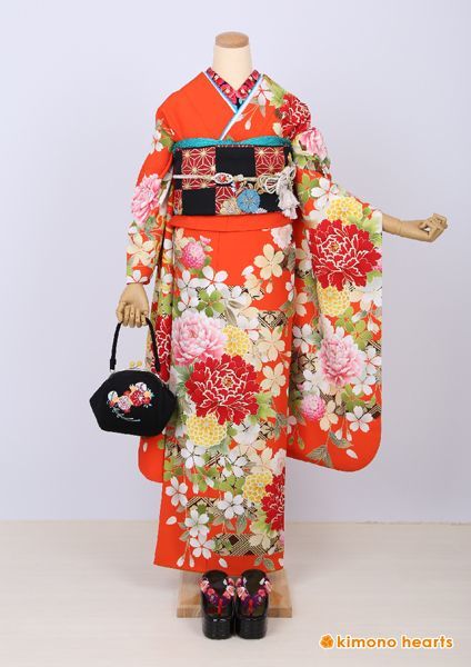 成人式フルセット レトロ カラフル オレンジ 牡丹