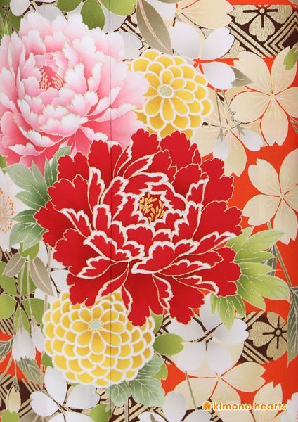 オレンジが目をひくレトロモダンな振袖。珍しい色に牡丹や万寿菊の柄が上品さを出してくれます