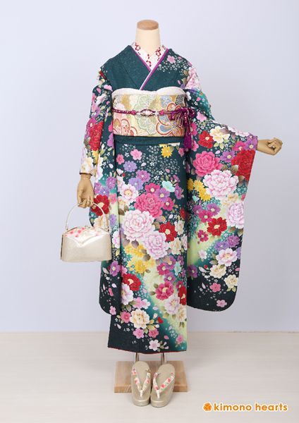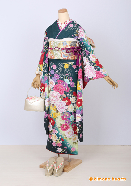 人気カラー。上品な深いグリーンの振袖。鮮やかな花々で彩られたデザインンは派手すぎず知的なイメージ。