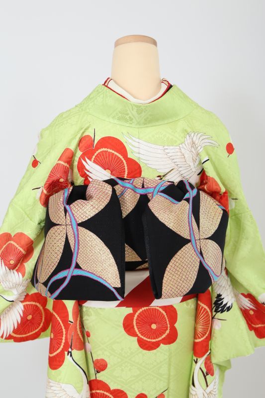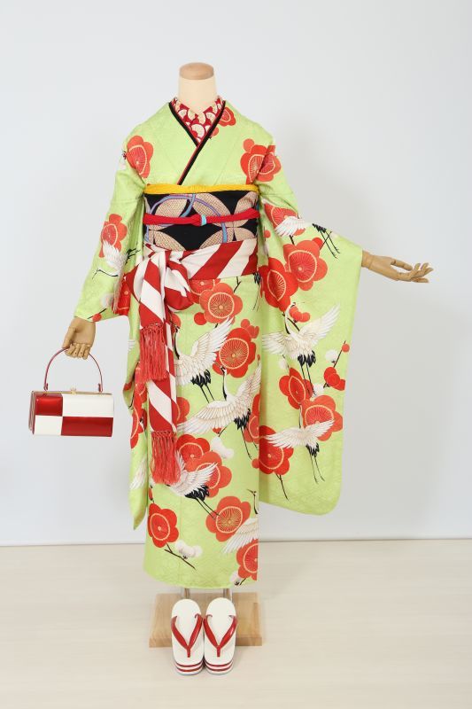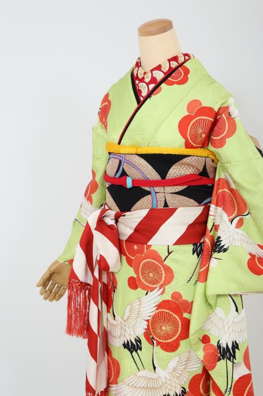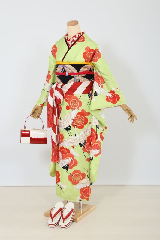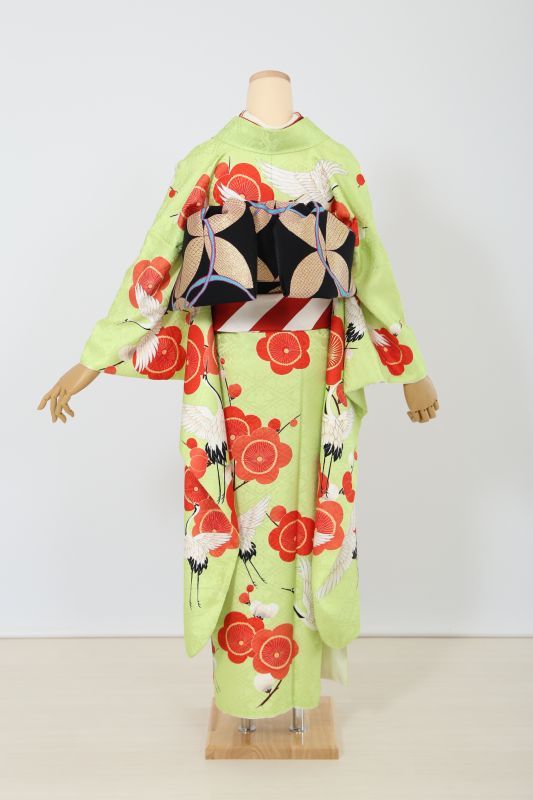 珍しい萌黄色に梅と鶴がお洒落な振袖。個性的な柄で回りとは違った雰囲気に。