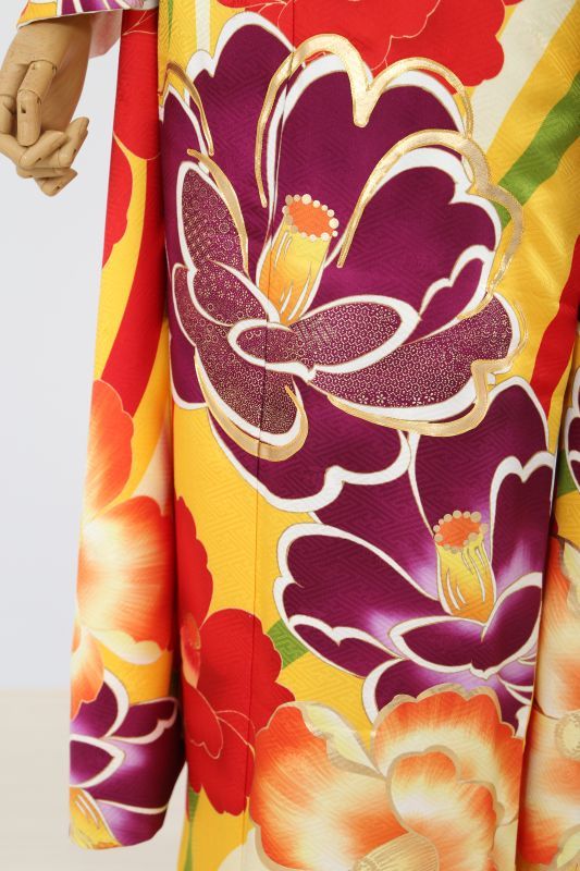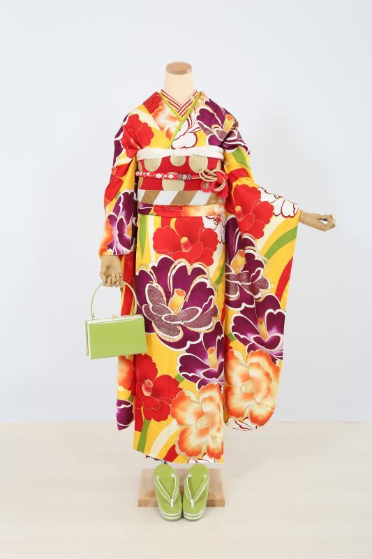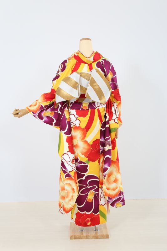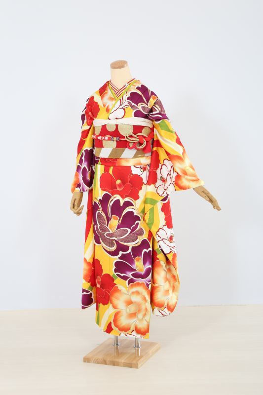 珍しい黄色のお振袖に大きな赤と紫の椿がインパクト抜群なレトロモダンなお振袖。遠くから見ても目立つので人と被りたくない方にオススメです。