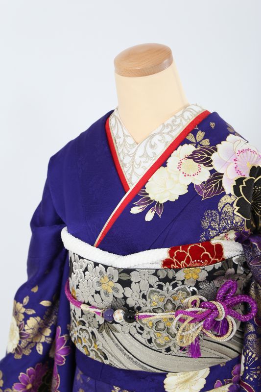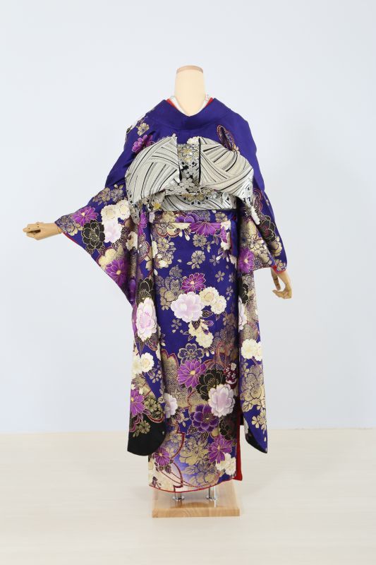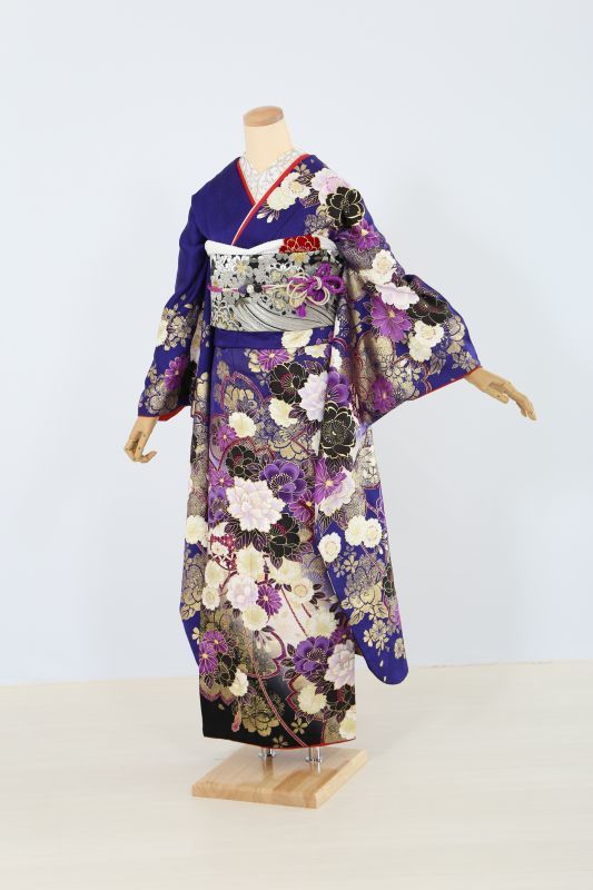 濃い青地に紫・白・黒のお花がたくさん入った格好いいお振袖。柄がたくさん入ってるのに色合いがまとまっているのでスッキリと着こなせます。