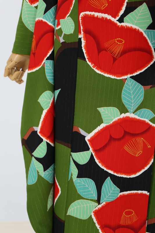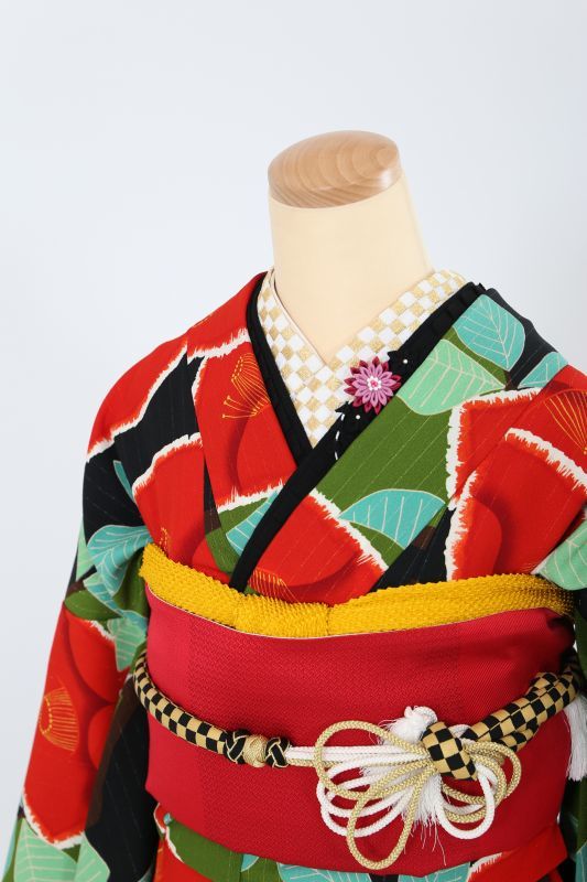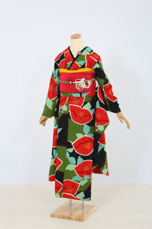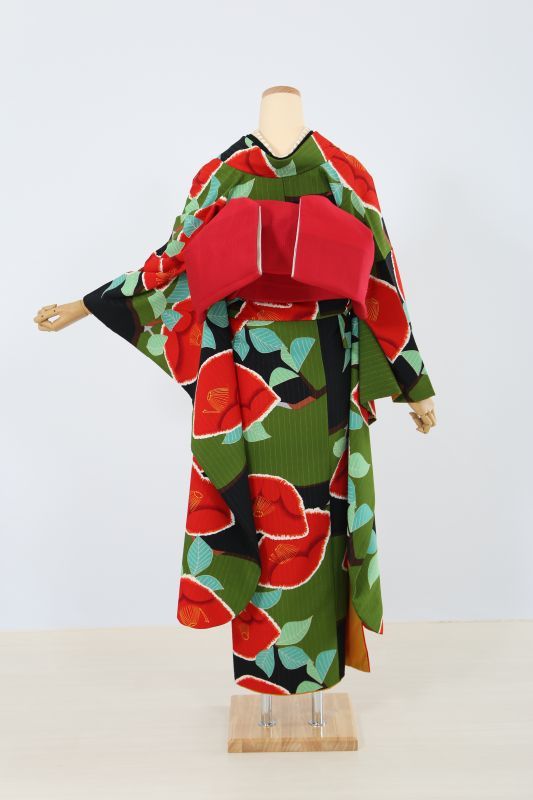 モスグリーンと黒色の地色に真っ赤な椿がレトロモダンなお振袖。地色が深い色なので派手すぎず、和風なイメージも残してくれます。