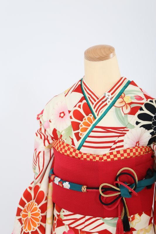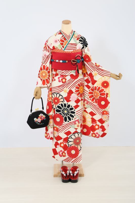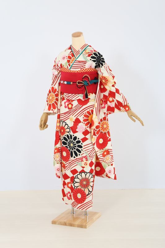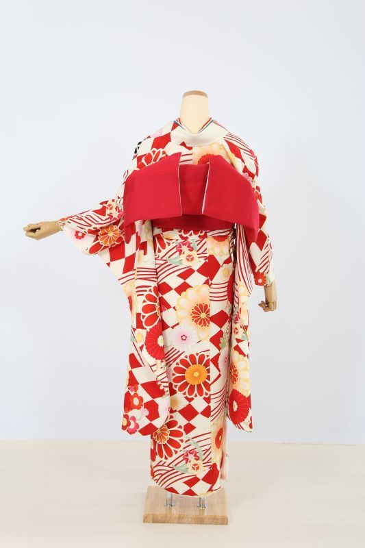 クリーム地に赤色で市松柄や菊花柄が入った、華やかなレトロモダンなお振袖。