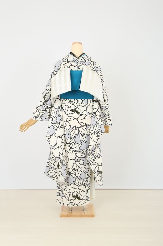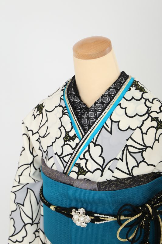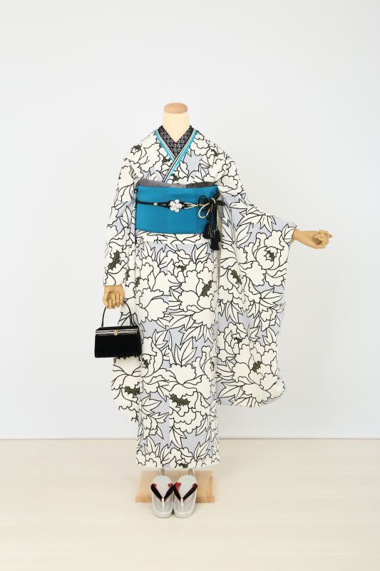 グレーに大きな白の牡丹がいっぱいの、和風館さんのブランドお振袖。