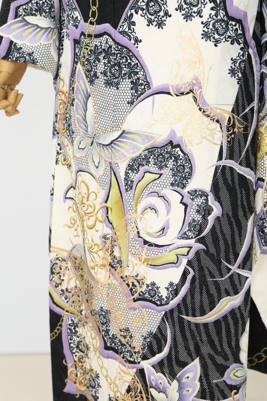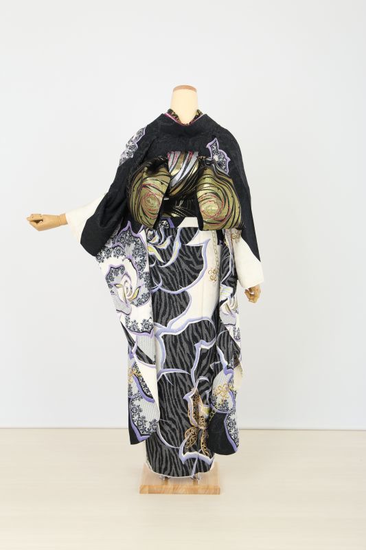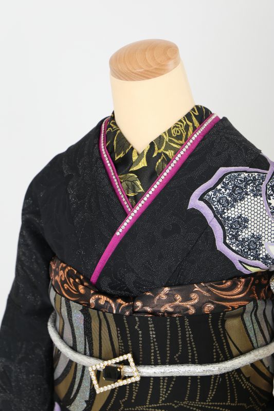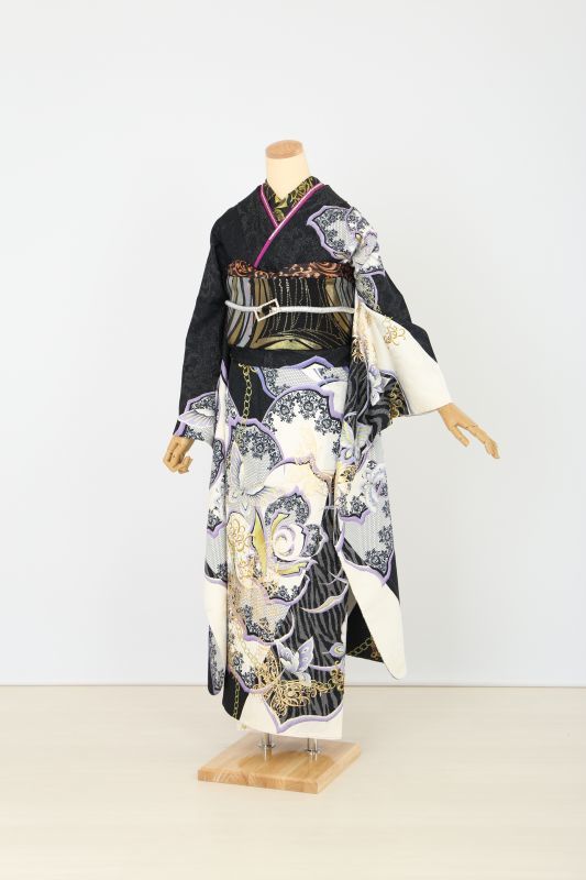黒地に大きなバラ、柄としては珍しいチェーンが入ったグラマラスのお振袖。 生地には銀糸が入っておりギラギラしてます。 ヒョウ柄も入ってて、派手にいきたいかたにおすすめです。