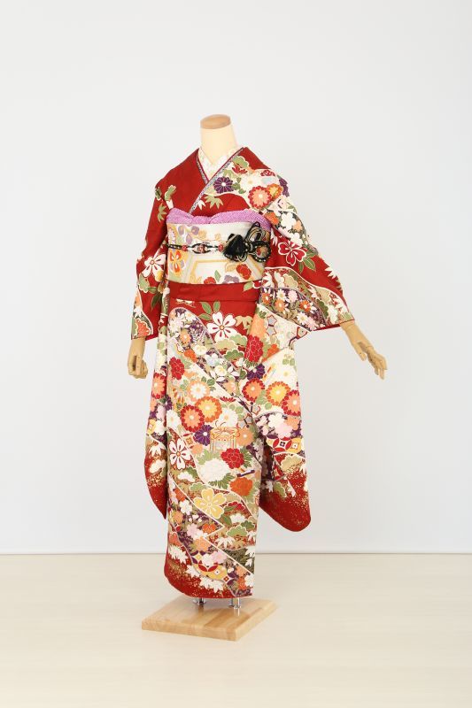 赤地に、たくさんの古典柄が入った豪華なお振袖。 古典柄の中には、橘・松・菊・牡丹・笹など 金彩で囲まれた沢山の柄が入って華やかです。