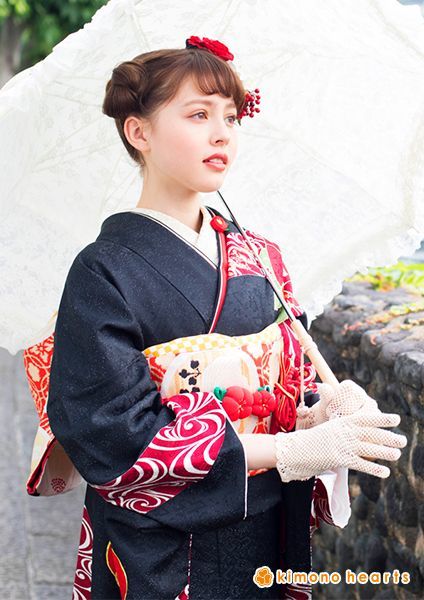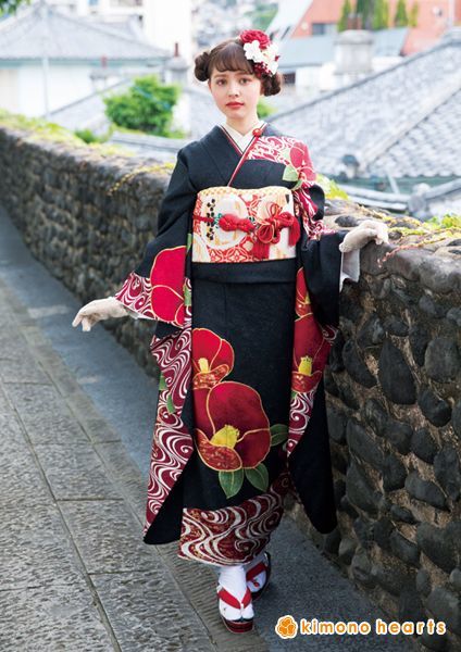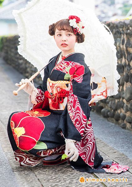 黒地のスッキリさに大胆な椿が印象的なお振袖。生地には金糸が織り込まれており、黒色なのにキラキラと華やかさを出してくれます。 格好良く、大胆に着たい方にオススメです。