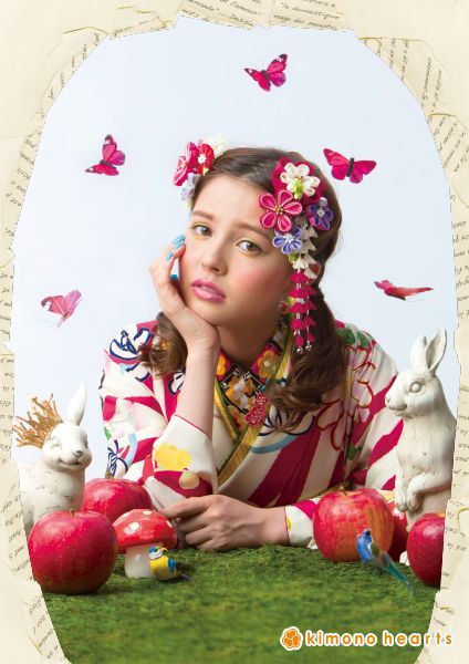 チェリーピンクとオフホワイトのストライプに、咲き誇る花。レモンイエローとの組み合わせでキュートに仕上げたら、ブルーのバッグでスパイスを。