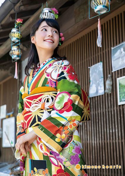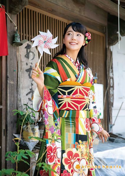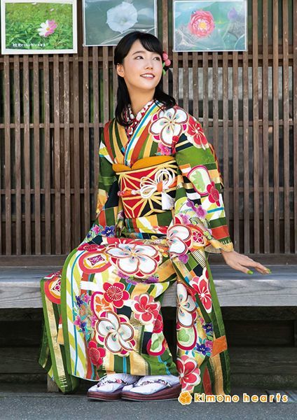 緑・黄色・橙色の色合いが印象的なトラディショナル振袖。麻の葉文様の上品な帯で振袖を引き立たせて。