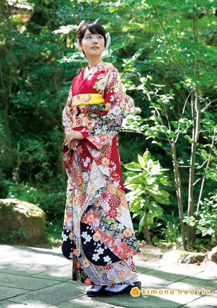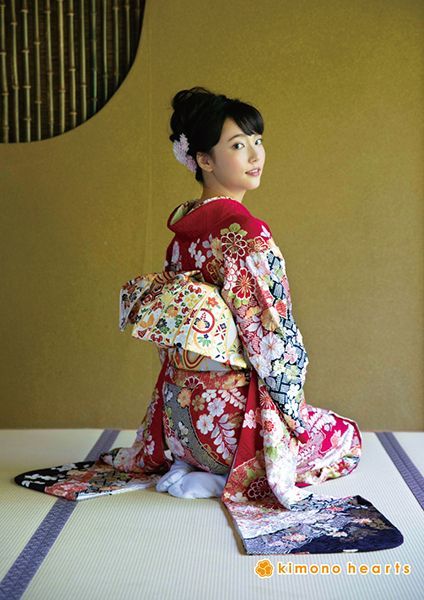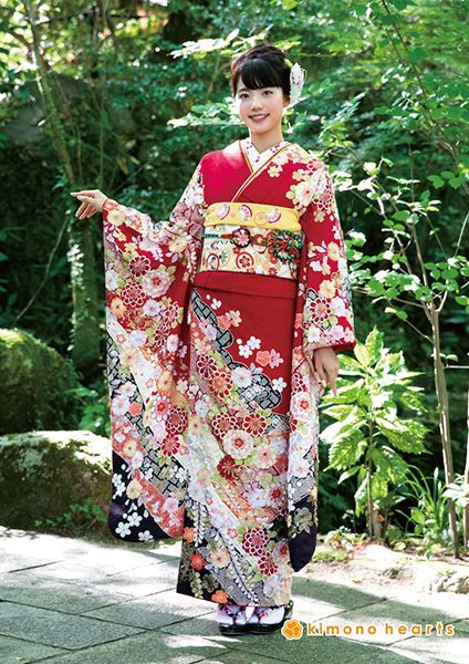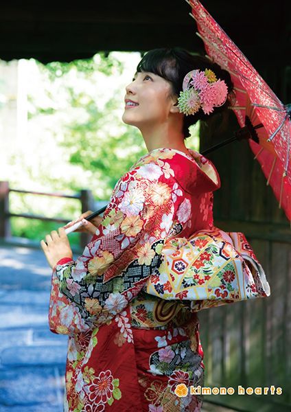 絞りの加工が豪華な、伝統的な古典柄のお振袖。鮮やかな赤がお顔に映えます。