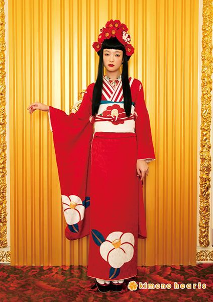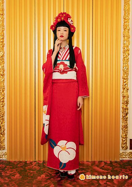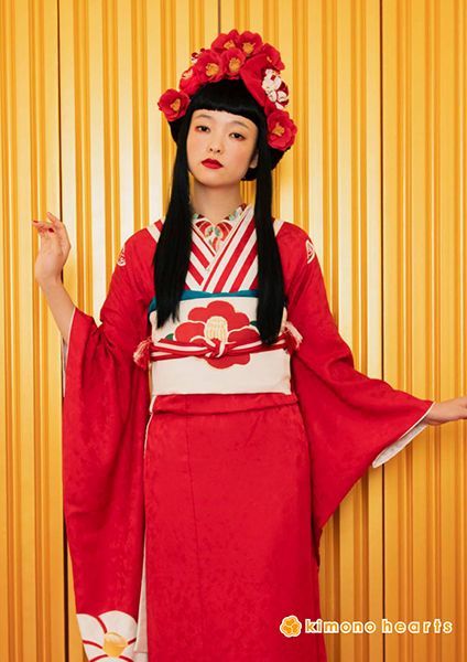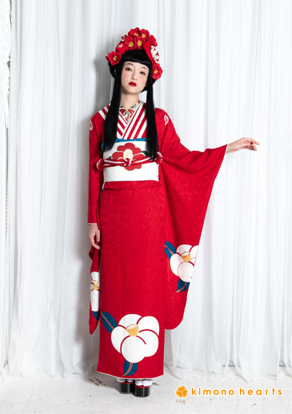 真っ赤なお色に大胆な白い椿柄。ストライプな衿に家紋をつけ、ネオジャパネスクなイメージです。キモノハーツオリジナル振袖で、人と被りたくない方にオススメです。