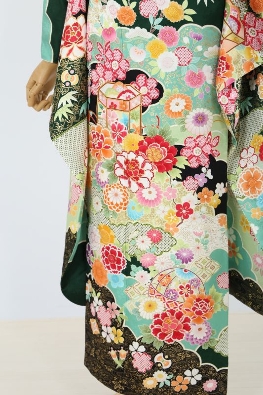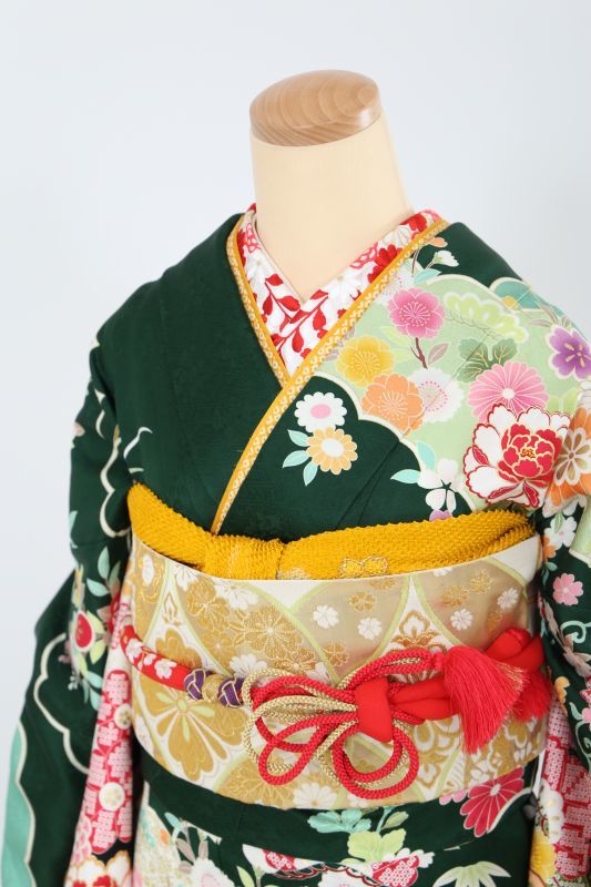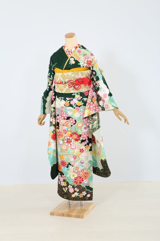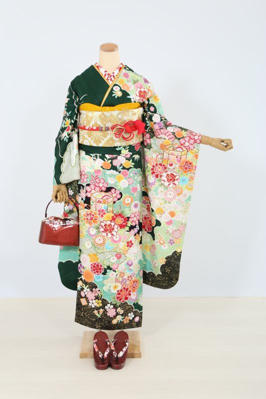 伝統的な古典柄のお振袖。雲取に小花がたくさんあり成人式・お祝い事にぴったりな一枚。 深い緑が大人っぽさを演出します。