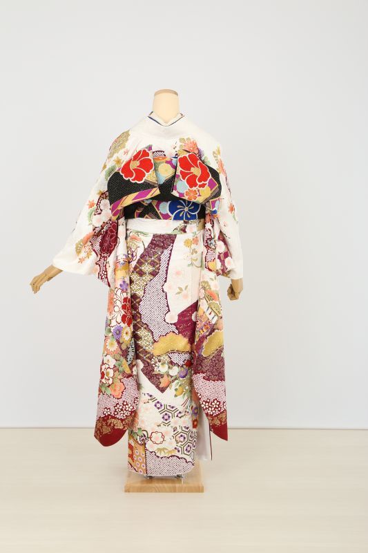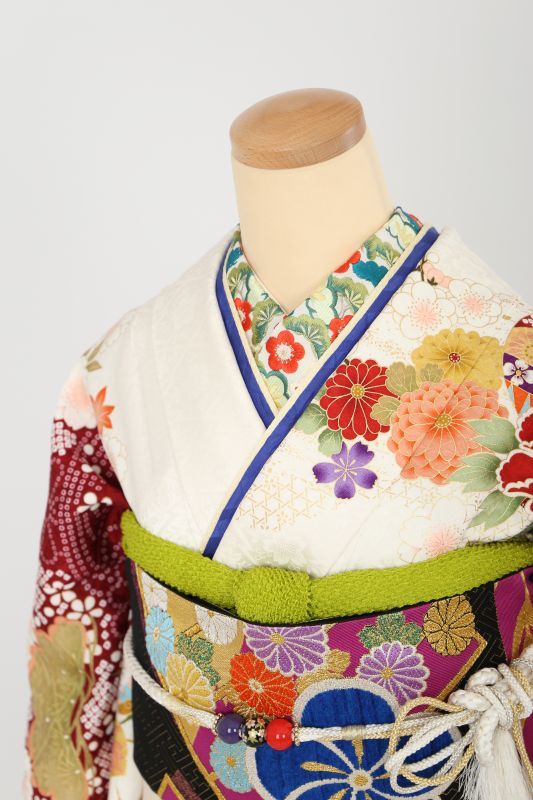 白地に 流水や松、菊などの伝統古典柄が沢山入った豪華なお振袖。裾に向かってエンジ色が多く入ってきて、上品な女性らしさを醸し出します。