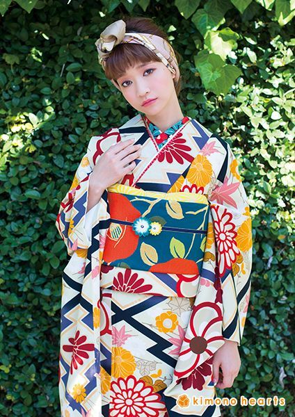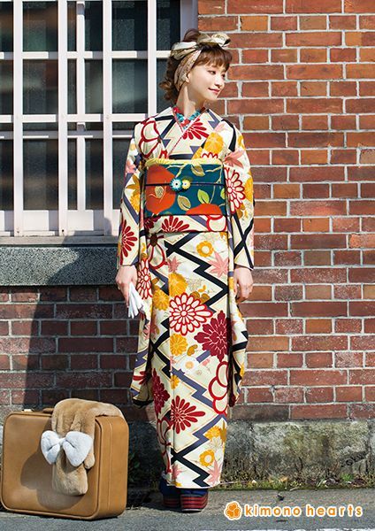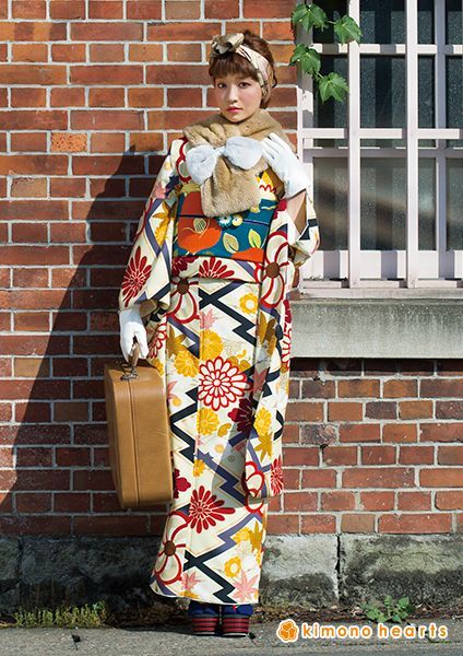 ノスタルジックな雰囲気漂うクリームいのモダン振袖。オレンジ椿の帯がポイント。