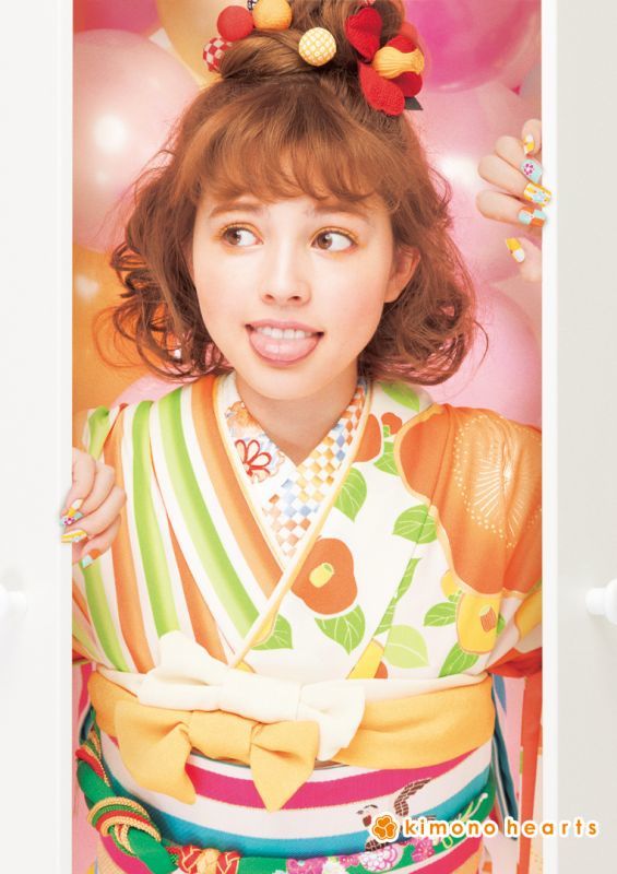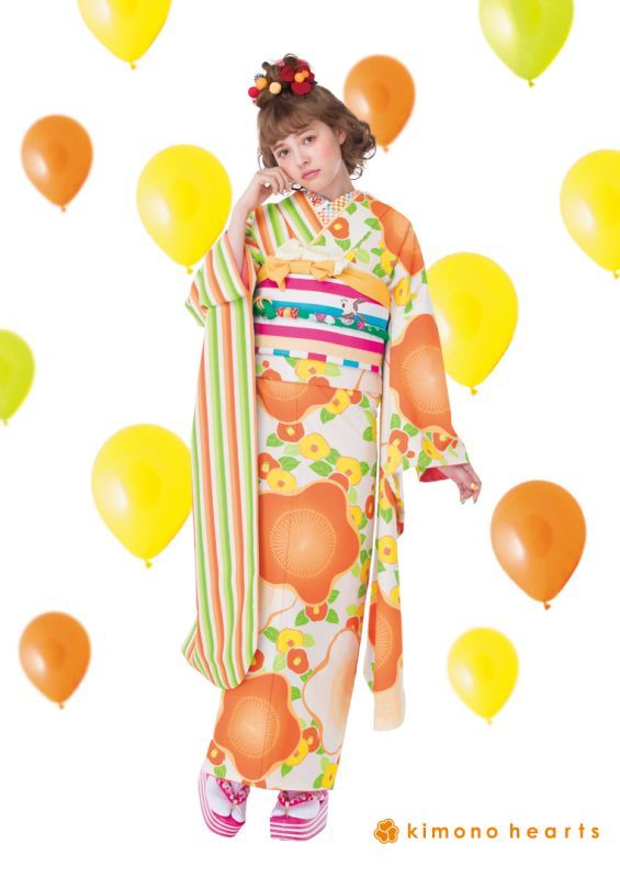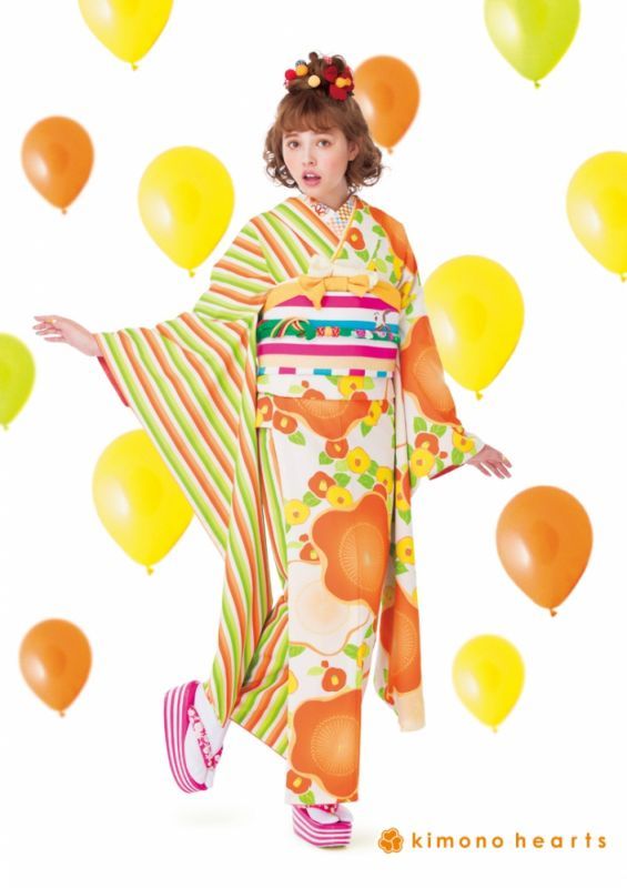大きな梅に小さな椿。そしてストライプがキュートなキモノハーツオリジナル振袖。 パステルなオレンジとグリーンが華やか