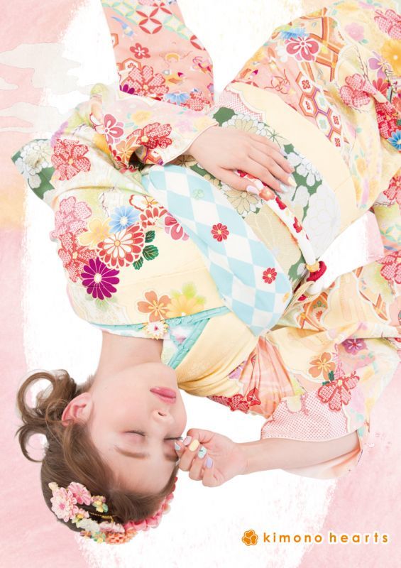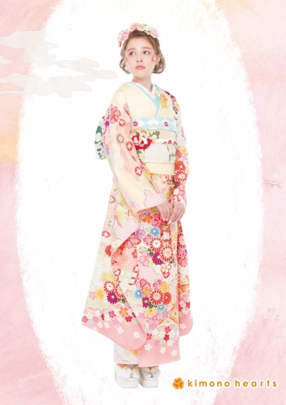 淡いクリーム色の珍しいお振袖。裾にはパステルピンクで、とことん女の子らしい可愛さを演出してくれます。可愛く上品になりたい方にオススメです。