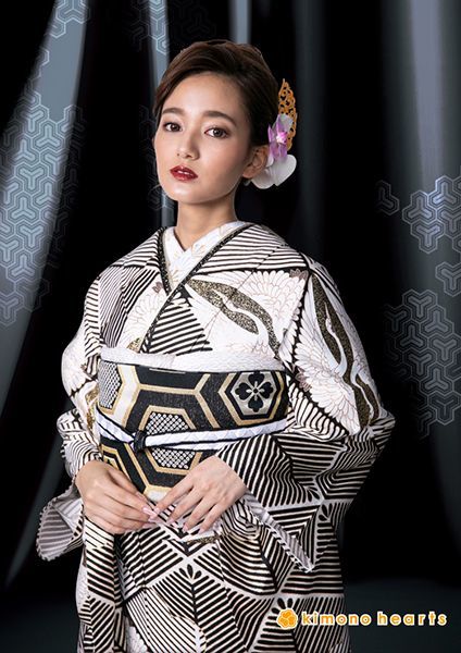 上品な白地に、菱で囲まれた鶴や松がすごく格好いいお振袖です。金箔も沢山使われて豪華差があり、伝統的な古典ながらも、モード・粋のどちらでもお洒落に着こなせます。