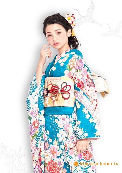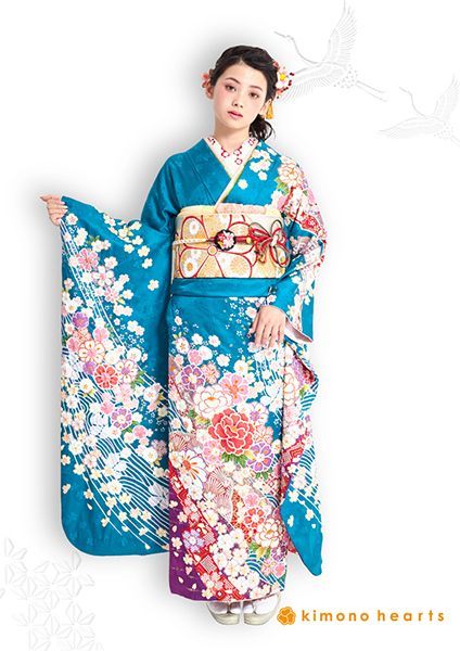 鮮やかなターコイズブルーが印象的な、華やかお振袖。小花柄が散りばめておりながらも裾に紫が入り、大人可愛いお振袖です。