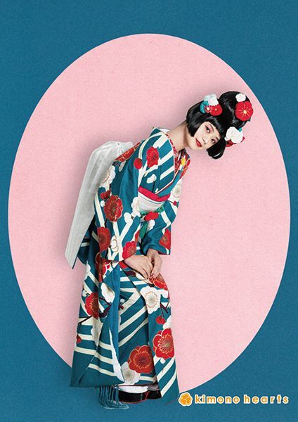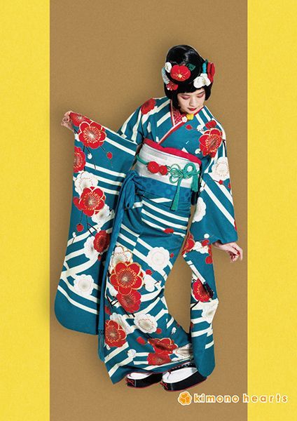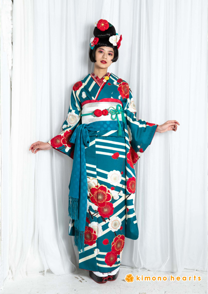 鮮やかなターコイズブルーが目を引くお振袖。個性的な幾何学な模様に、赤と白の梅柄が華やかさを出してくれます。 人と違った、お洒落にしたい方にオススメです。