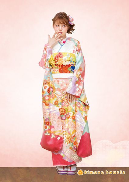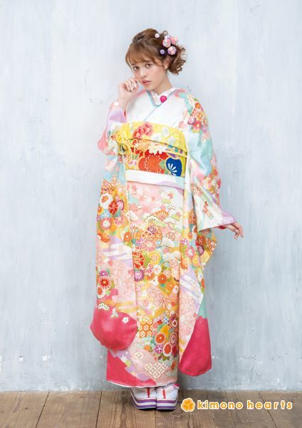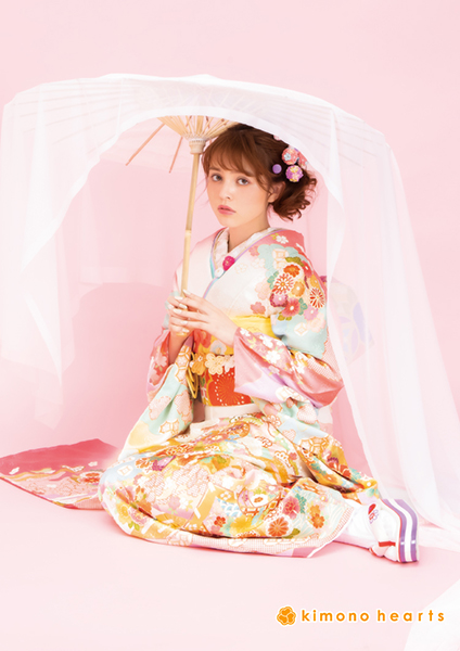 裾は濃いピンクで引き締めながら、白地に淡いお色が上品なお振袖。伝統的な古典柄ですが、とにかく可愛く上品になれます。