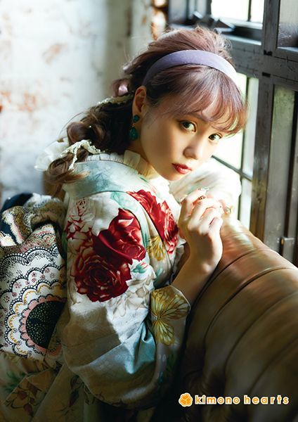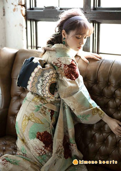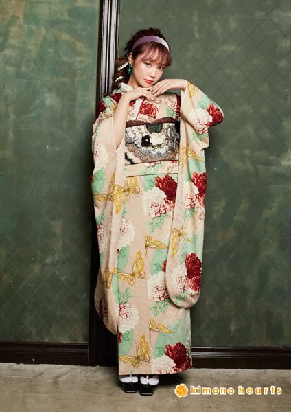 ベージュピンクの色にアンティークな薔薇がお洒落な、モダンアンテナさんのお振袖。蝶々がよりガーリーさ演出してくれます。