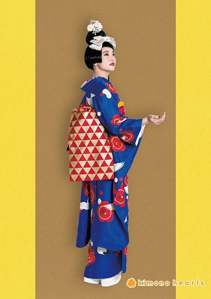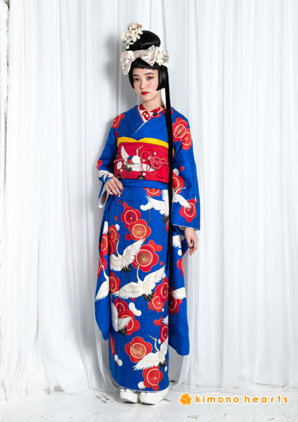 目の覚めるような真っ青なお色に、鶴と梅がインパクトのあるお振袖。光沢のある綸子の生地が青色の発色の良さを際立たせています。