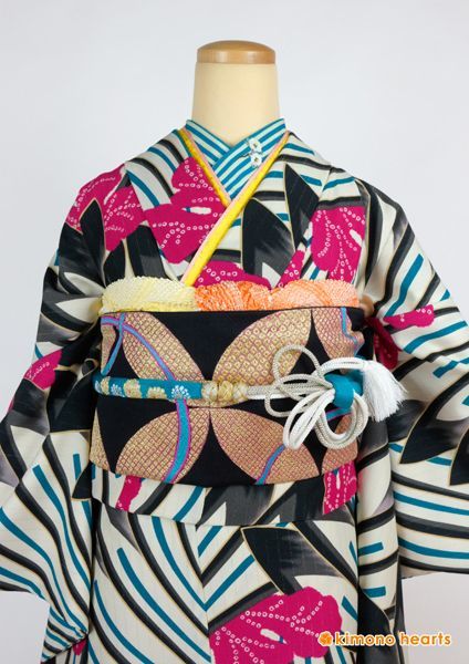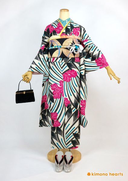 大胆な柄が印象的な大正ロマンな振袖。ターコイズブルーを差し色にレトロモダンコーデ。