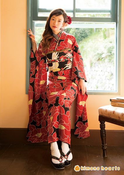 大胆な椿の柄が印象的。アンティーク調の鶴の帯で華やかに。