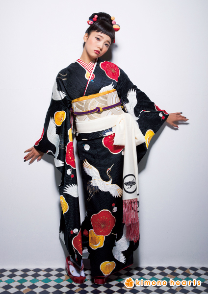 紅梅黄梅に鶴が舞う振袖に、シルバーの帯がなんとも粋な組み合わせ。同じ鶴をあしらった白いしごきで、人とは違う私を演出。
