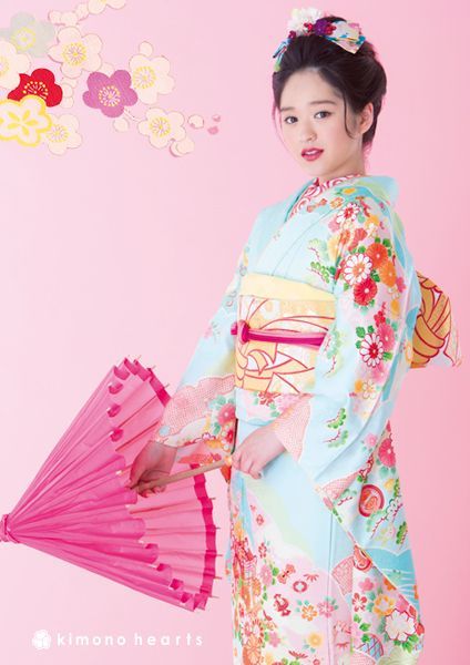柔らかな水色に、ころころとした菊が愛らしい。帯の熨斗柄と帯締めの濃いめピンクで甘酸っぱく仕上げて。