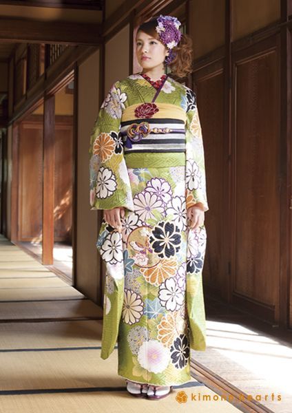 淡い緑を印象づける黒い花。帯にも黒を取り入れて、個性的な愛らしさを引き立てて。