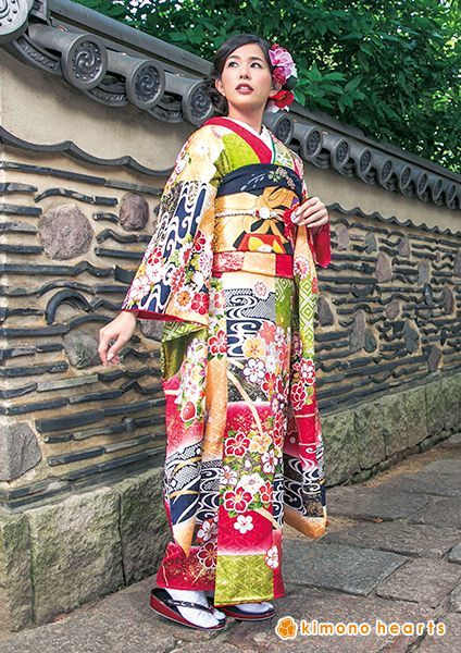 和の心を感じる赤と緑の振袖。黒を取り入れることで大人の女性らしい装いに。