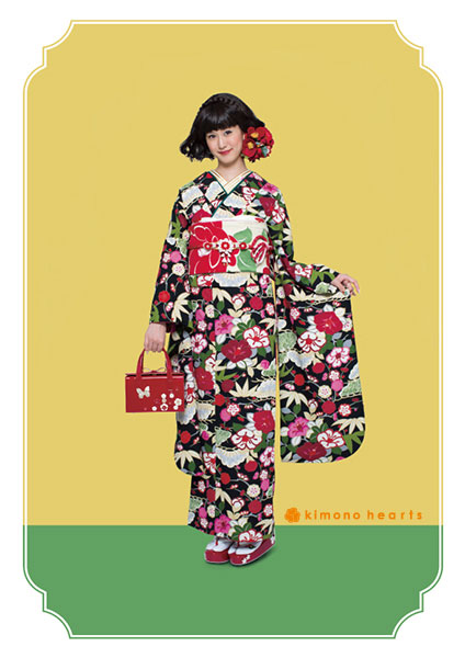 黒地に咲く松竹梅がなんともノスタルジック。絣調の帯と、椿柄のまるぐけ帯締めでアンティークを演出。 紅白の小物を合わせると、さらにハレの日にピッタリのコーデに! レトロモダンな雰囲気にすることもできます。