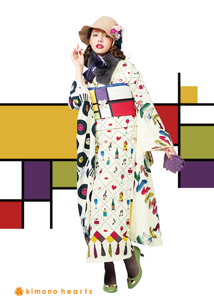 イマドキの柄が散りばめられた色地のレトロモダンなお振袖。ツモリチサトさんデザインで、どこをみても柄が違います。 とにかく目立ちたい方にオススメです。