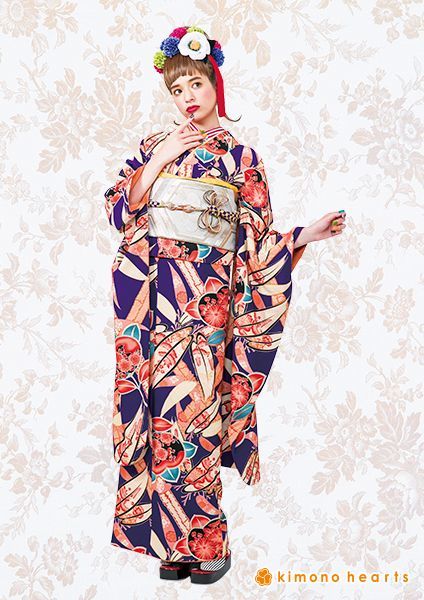 紫地に大柄が映える。あえてシンブルな帯を合わせて小粋にまとめて、ロマンティックな雰囲気に。
