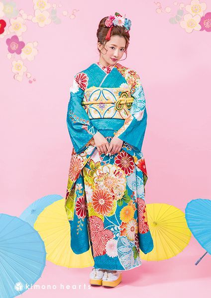 空色と大輪の花が珍しい振袖には、大きな七宝柄の帯が個性的で◎。日本髪風に結い上げれば色っぽかわいく。